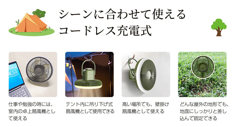 アウトドアで使う方は、扇風機の配置をどこにするかなどその日のキャンプスタイルに併せて変わる方も多いと思うので、扇風機の配置する選択肢が5通りもあるのありがたいですよね?