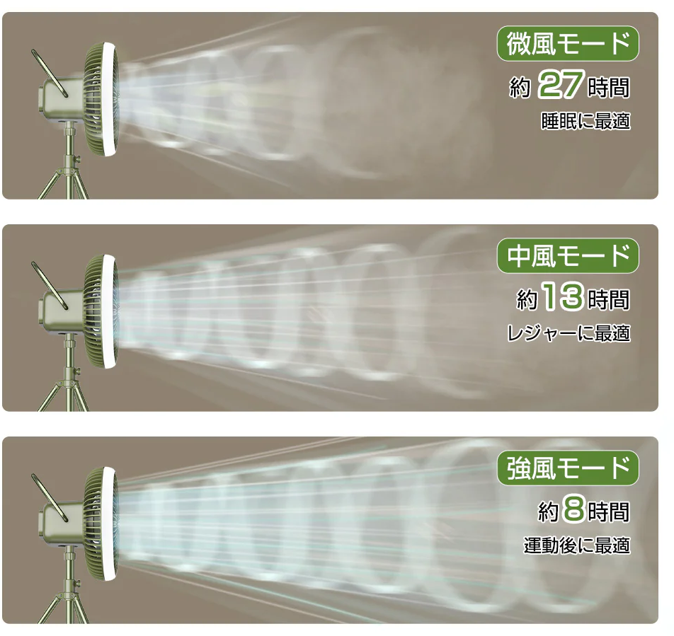 キャンプや車中泊で寝ているときに扇風機をしながら充電できるのがありがたい….