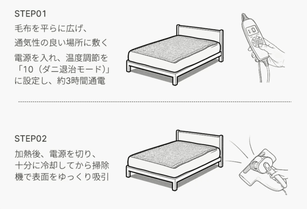 そんなときは、公式HPにもある通りダニ退治モードして手入れすることで長く安心して使えます♪