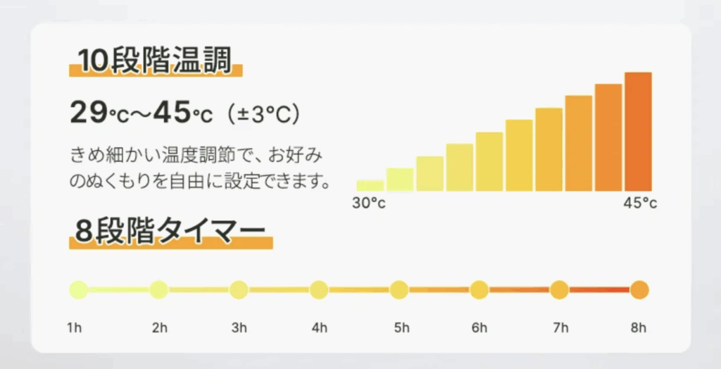 - 8時間タイマー付きで好きなときに電源を消せ、10段階温調可能